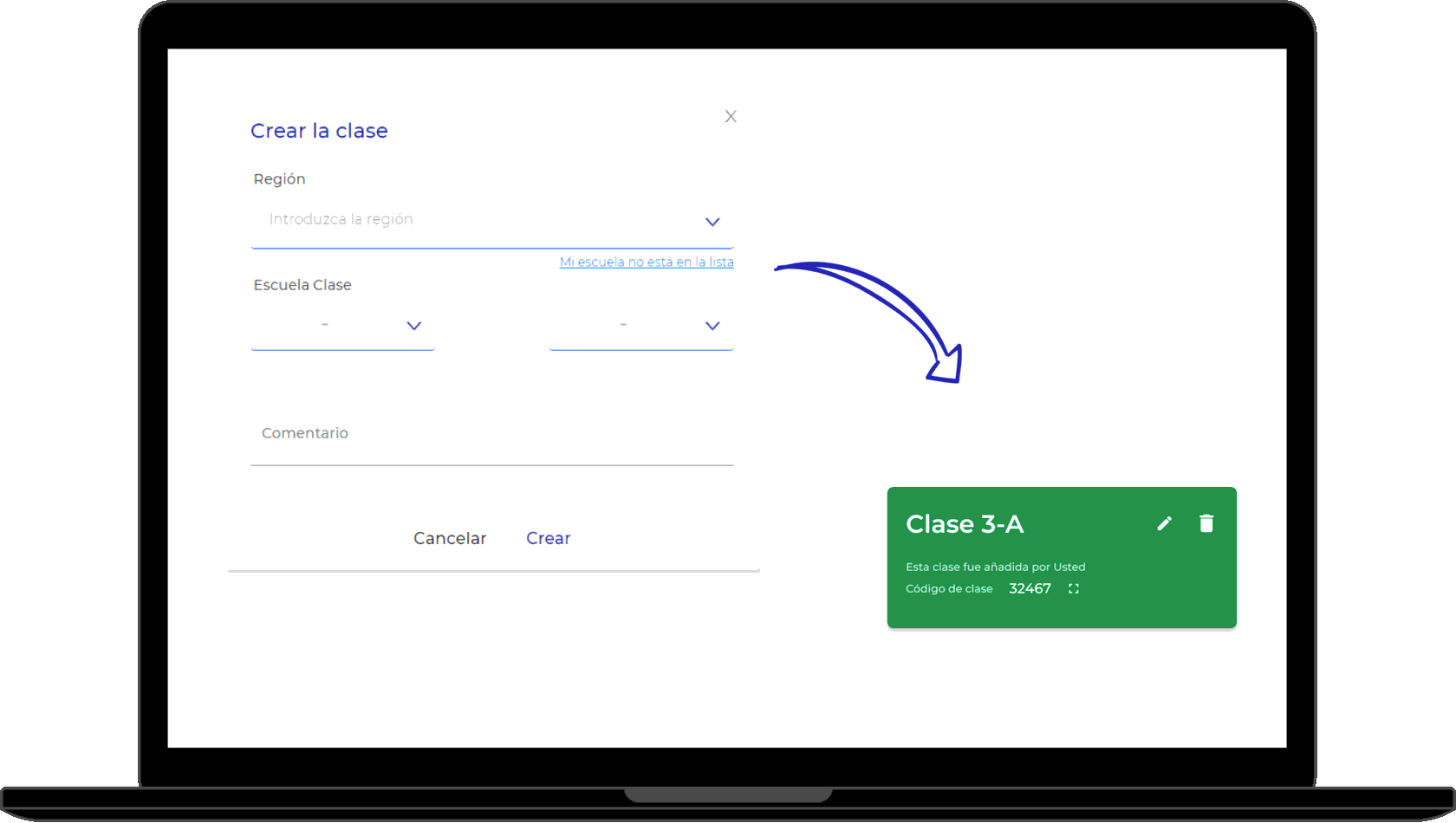 Cree una clase a la que quiera enviar deberes de casa. Cuando la clase haya sido creada, usted recibirá el CÓDIGO DE CLASE por medio del cual los estudiantes pueden unirse a ella