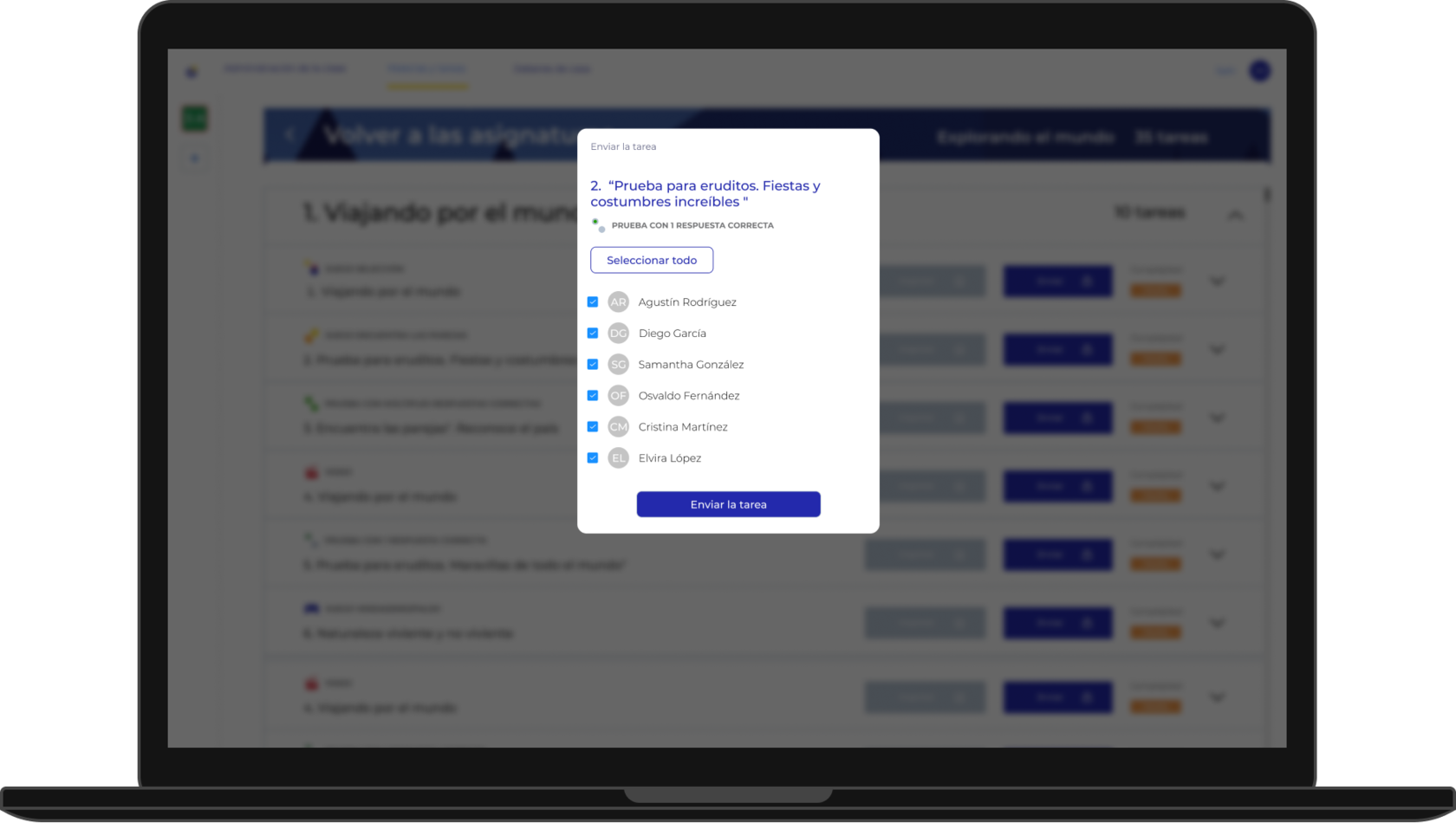 ¡Hurra! Ahora usted puede enviar deberes de casa. En la pestaña "Asignaturas y tareas", seleccione la asignatura, el tema, la tarea y haga clic en "Enviar". Los alumnos recibirán la tarea directamente en su teléfono inteligente.